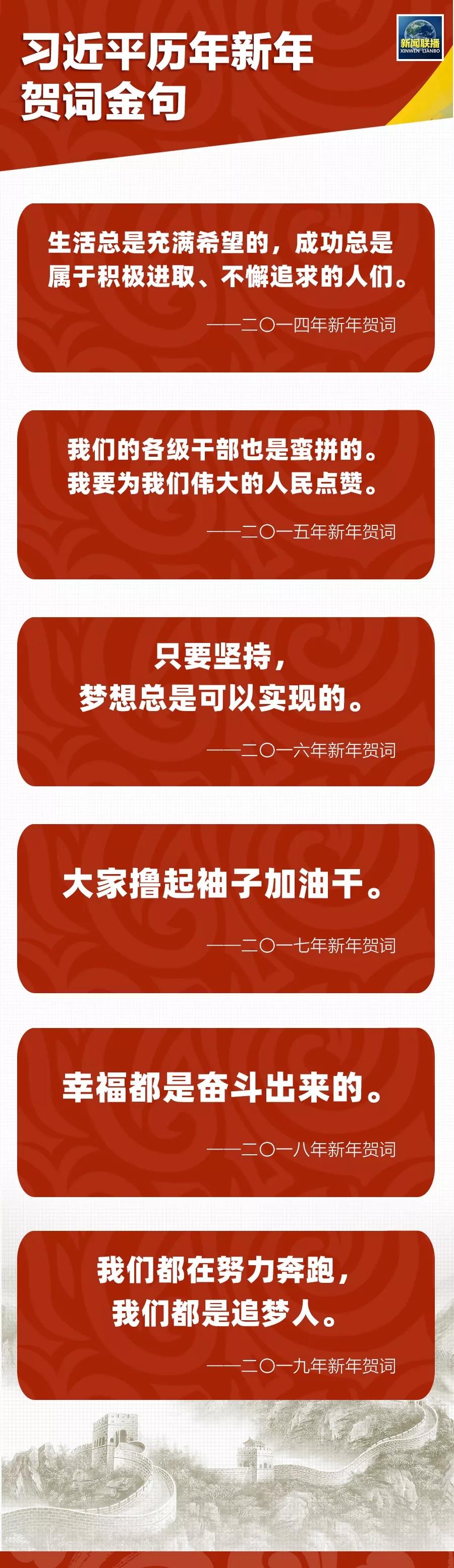 回顧習(xí)主席已經(jīng)發(fā)表的6篇新年賀詞,我們發(fā)現(xiàn),這些講話言簡意賅、短小精悍卻又內(nèi)涵豐富、亮點紛呈。