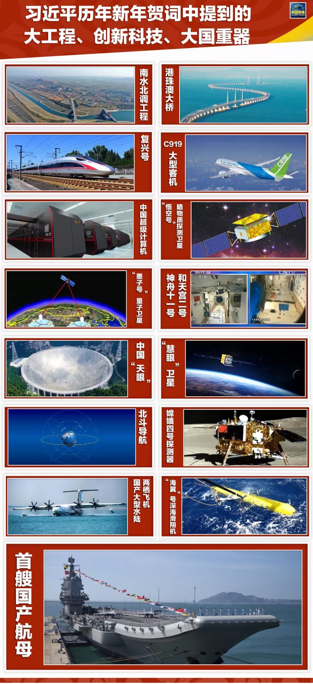 習(xí)主席的新年賀詞,還多次提到我國的一些大工程和科技創(chuàng)新成果,有的還不止一次被提及。比如,“國產(chǎn)航母”“暗物質(zhì)探測衛(wèi)星”等就都被提到了兩次。